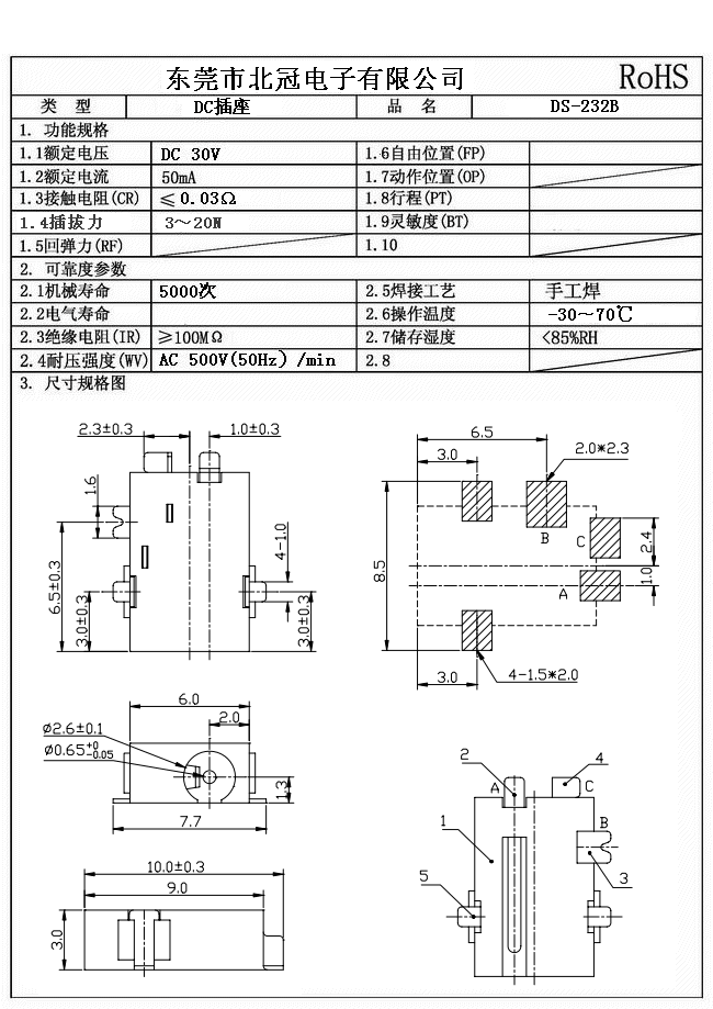Typical Specifications 1. Rating : DC 30V 0.5A 2. Contact Resistance : 70?Max 3.Lnsulation Resistance: DC500V 1Minute 4.Operating Temperature Range: -25℃+80℃ 5.Ambient Humidity Used: ≤85%RH 6. Operating Force : 3-20N 7. Operating Life : 5,000Cycles