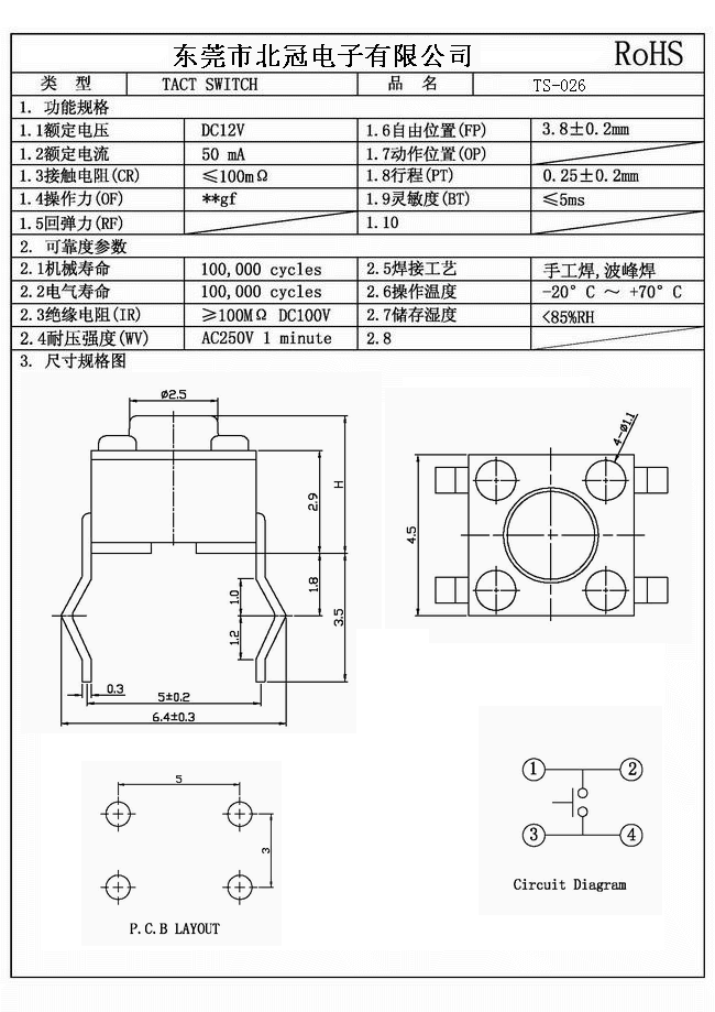 產(chǎn)品名稱:TS-026輕觸開關(guān) Typical Specifications |