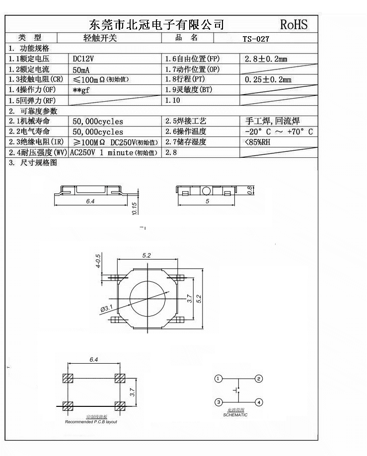 TS027又稱為TS-1187N輕觸開關(guān)尺寸為:5*5*0.85,市場上稱為4*4帶防塵輕觸開關(guān),為貼片型輕觸開關(guān),可以過回流焊接,高密度貼裝的表面貼裝,