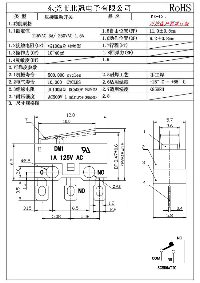 Typical Specifications 1.Rating : DC30V 0.1A 2.Contact Resistance: ≤100mΩ 3.Lnsulation Resistance: ≥100mΩ DC500V 4.Operating Temperature Range: -25℃+85℃ 5.Ambient Humidity Used: ≤85%RH 6.Mechanical Life: 100,000Cycles 7.Operating Force:30±10gf 8.OP:8.8±0.8mm 9.Order: AC 125V 3A