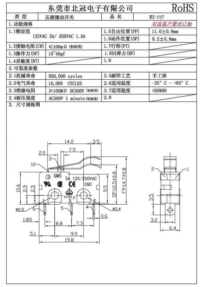 3.Lnsulation Resistance: ≥100mΩ DC500V