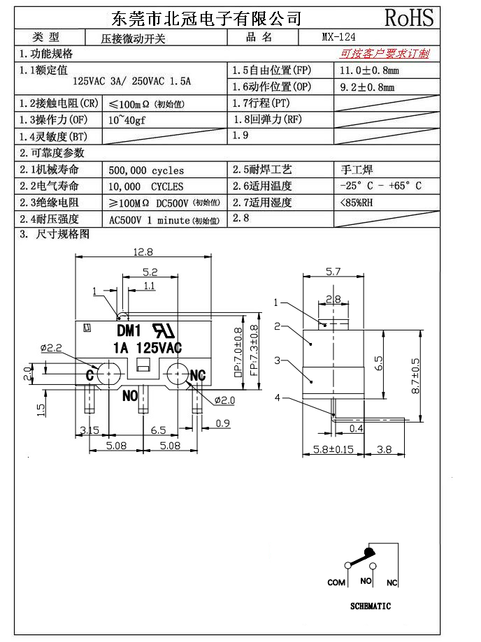 Typical Specifications 1.Rating : DC30V 0.1A 2.Contact Resistance: ≤100mΩ 3.Lnsulation Resistance: ≥100mΩ DC500V 4.Operating Temperature Range: -25℃+85℃ 5.Ambient Humidity Used: ≤85%RH 6.Mechanical Life: 100,000Cycles 7.Operating Force:30±10gf 8.OP:8.8±0.8mm 9.Order: AC 125V 3A