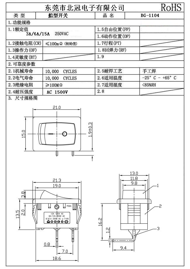 技術參數(shù)〔SPECIFICATION〕 額定電流、電壓: 6(4)A 250VAC 6A/125A 250VAC 6A 250VAC/10A 125VAC 接觸電阻:≤20mΩ 絕緣電阻:≥100MΩ 介電強度:≥1800VAC/3S 電器壽命:≥10000次